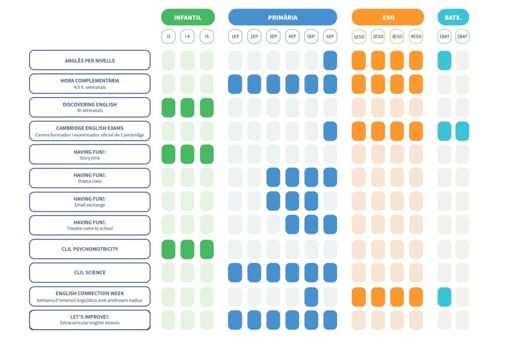 El nivell 1+ és per a aquells alumnes que tenen un alt grau de coneixement, el nivell 1 és per a aquells que tenen els coneixements corresponents al curs i el nivell 2 és per a aquells alumnes que tenen dificultats en l’aprenentatge de l’anglès. El nivell més nombrós sempre es duplica. Aquesta forma de treballar ens permet atendre les diferents necessitats dels nostres alumnes i treure’n el millor de cadascun d’ells. Els grups són totalment flexibles per tal de motivar-los.